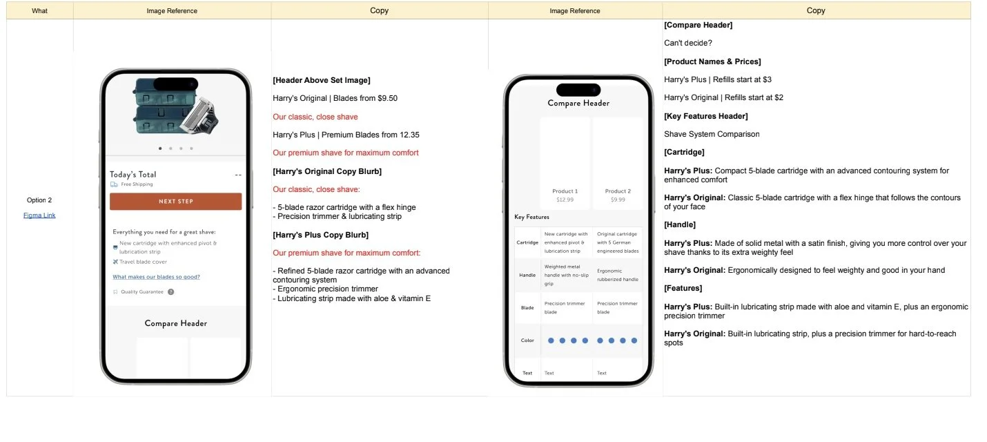 Our Solution: Created a clear comparison chart on all e-comm pages to highlight product differences. Refined subscription flow content for both Harry’s Original and Plus to reduce friction and improve transparency.