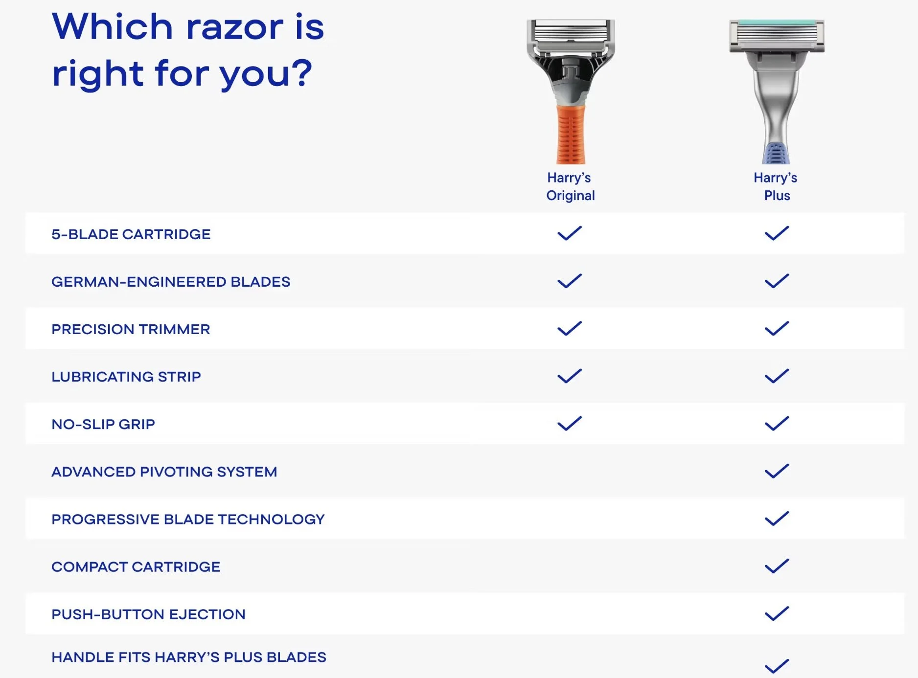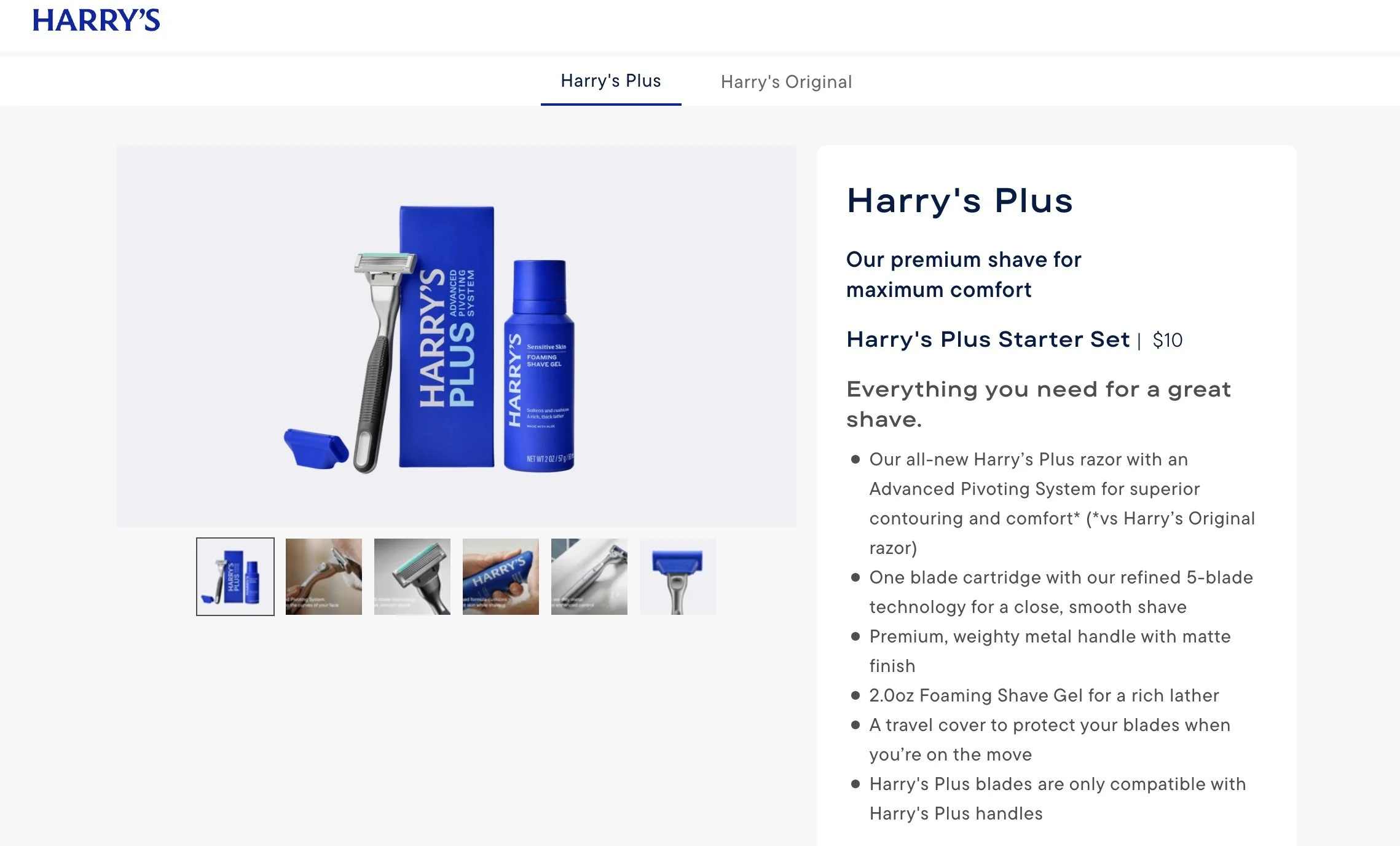 Harry’s Original vs. Harry’s Plus toggle above for ease